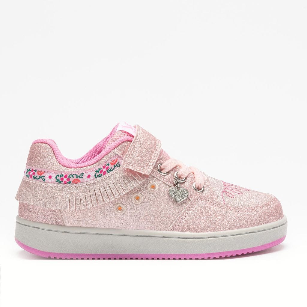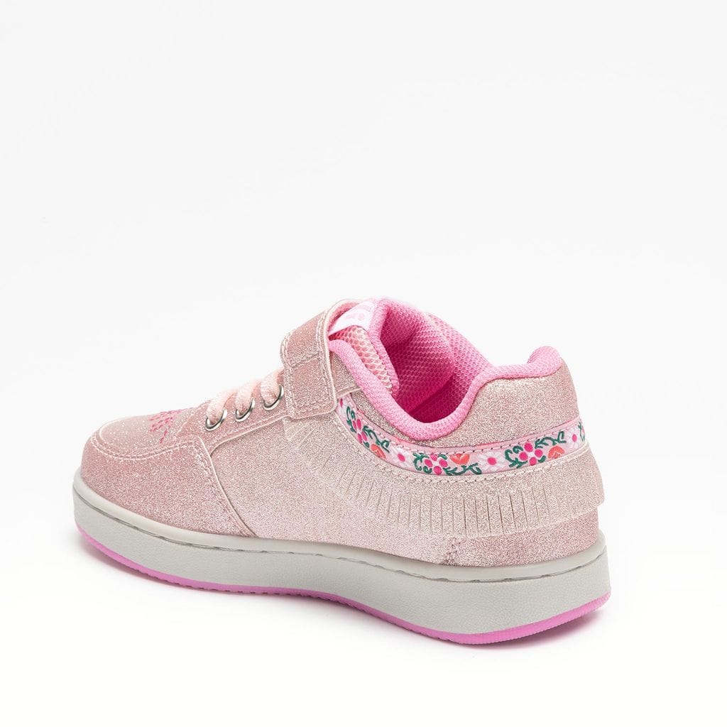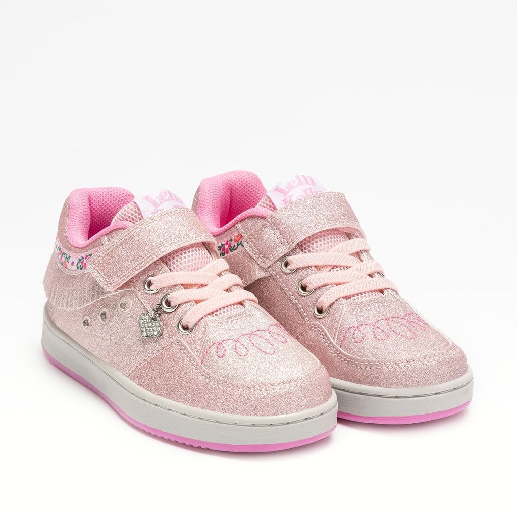 Partea superioară este realizată din glitter strălucitor și sclipitor, oferind un aspect spectaculos și atrăgător. Designul este completat de franjuri decorative și o panglică cu motive florale, alături de un accesoriu tip pandantiv în formă de inimă cu efect diamantat, care adaugă un plus de stil și personalitate. Cusătura decorativă frontală și logo-ul Lelli Kelly vintage aplicat pe limbă evidențiază autenticitatea modelului.