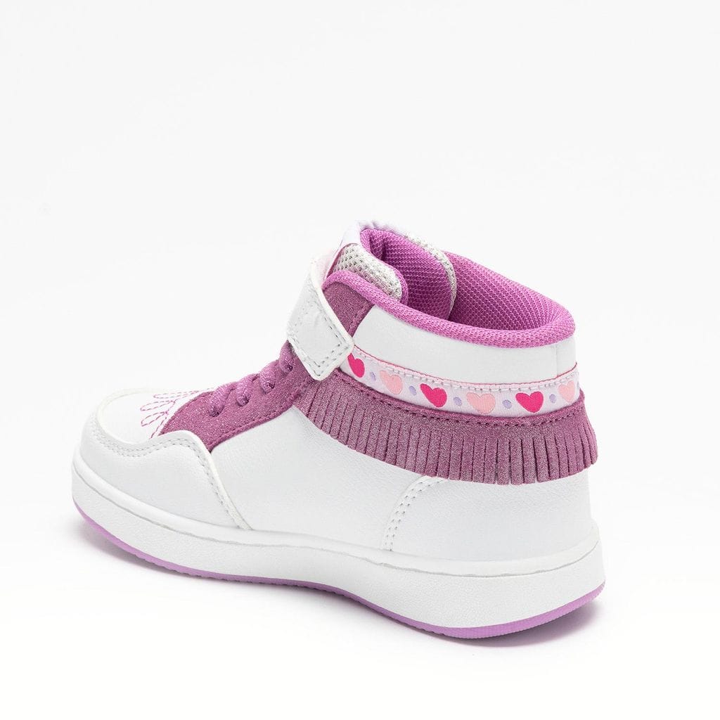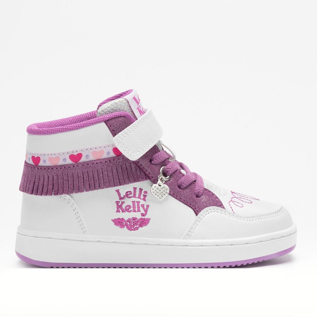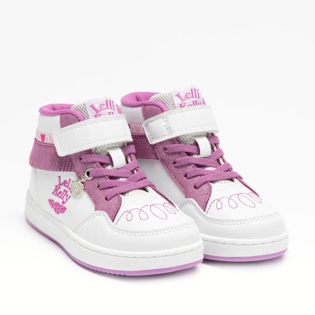 Детские высокие кроссовки (high top) Lelli Kelly — стильная и современная обувь, созданная специально pentru activных девочек. Верх выполнен из двухцветного технического материала с блестящими вставками с эффектом глиттера, что придаёт обуви яркий и модный вид. Дизайн дополнен декоративной бахромой и лентой с узором в виде сердечек, добавляющими образу нежность и индивидуальность.